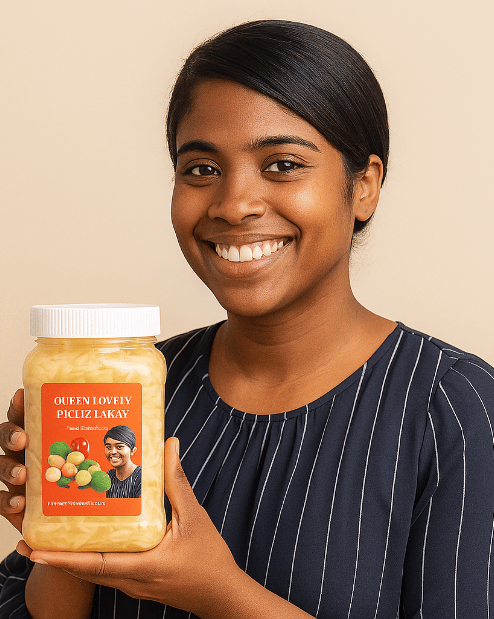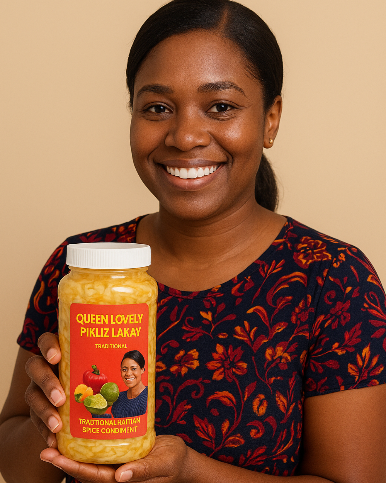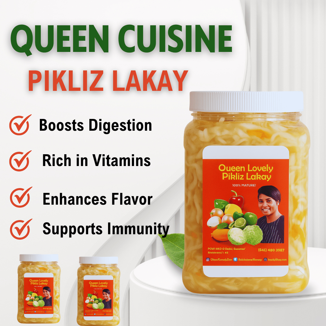 Queen Lovely Pikliz Lakay is a traditional Haitian spicy pickled vegetable mix, crafted with fresh ingredients to add bold, authentic Creole flavor to any dish.